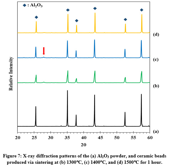 Figure 7: X-ray diffraction patterns of the (a) Al2O3 powder, and ceramic beads produced via sintering at (b) 1300°C, (c) 1400°C, and (d) 1500°C for 1 hour.
