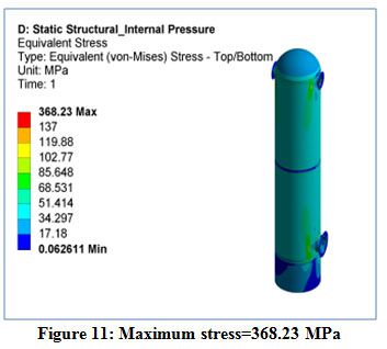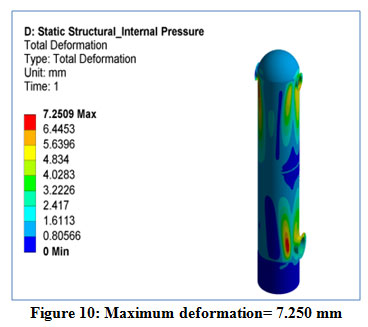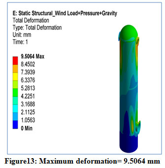 In case the maximum deformation 9.5 mm in vertical pressure vessel although it is safe for self weight because , maximum stress(von-mises) is less than total stress (i.e. membrane stress, S + bending stress, 2S) where S= allowable stress, 137.89 MPa. Maximum stress, 375.23 MPa < total stress, 413.67 MPa, Therefore, vertical column is safe from structure point of view.