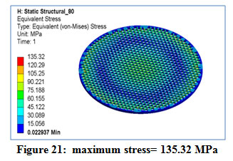 Tube-sheet Optimization with Point Load and pressure of 0.05 MPaTube-sheet analysis with Point Load 2.5 kg of each tube and pressure of 0.05MPa is complete with lessening the tube-sheet thickness to obtainthe optimum thickness. The stress at 80 mm thickness of tube-sheet is 135.32MPa which is nearest and less than allowable stress. So the final Optimum thickness for tube-sheet with Point Load of each tube and Pressure of 0.05MPa is decided at 80mm.