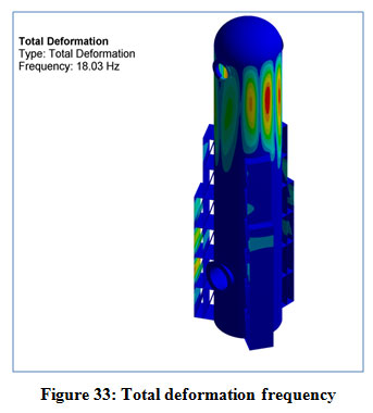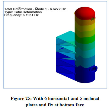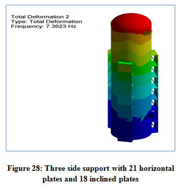 3.By keeping in mind above consideration there are various model of column with different layout of support are developed. The last model as shown in fig.6.42 is achieving targeted natural frequency or more than and it is safe from structural point of view so we finalised that model.FEA analysis carried out in present work are very helpful in order to increase natural frequency of any vessles that is oriented vertically by adding some supports/stiffeners or making some structural modification.