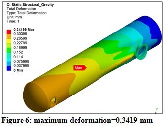 The gravity results display extreme deformation is 0.3419 mm and maximum stress is 10.82 MPa. At these vessel is safe for self-weight.