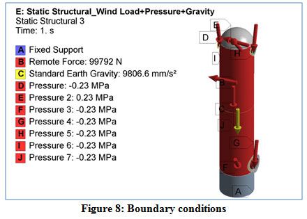 Applying internal Pressure of 0.23 MPa on all bodies of pressure vessel& using remote force of 99792 N, which is acting on the circumference of the vessel.