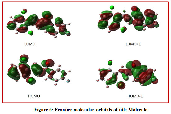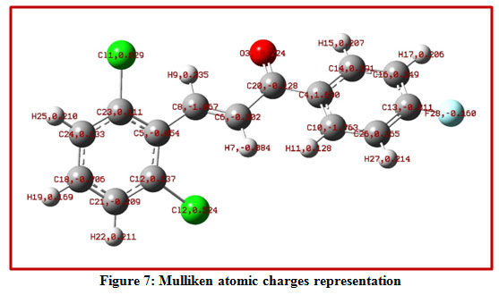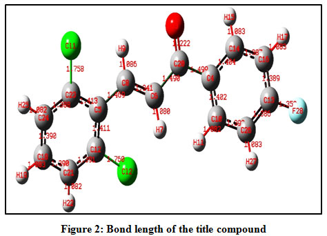 The optimize structure of the title compound with the labelling of atoms shown areFig.1 The molecular structure of the title compound contains two six membered rings in which, one is 2, 6-dichloro substituted ring attach to C=C of enone system (ring B) and another ring is a 4-Fluoro substituted ring attach to carbonyl group (ring A).The α, β-unsaturated ketone is confirmedby the shorter bond length O2-C20 and C6-C8 are found to be 1.223Å, 1.34Årespectively. The C 13-F28, Cl1-C23 and Cl2-C12 bond lengths are 1.352 Å, 1.757Å and 1.759Å respectively and foundwithin the normal range.Allthe bond lengths are within the normal range and compared with the previously reported structure [22-26].The calculated C 20-C6,C8-C5torsion angle is 179.50 confirms the molecule exhibits E configuration, which shows trans geometry.