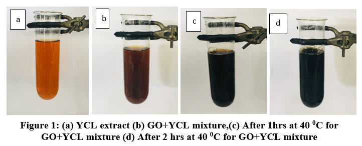 Figure 1: (a) YCL extract (b) GO+YCL mixture,(c) After 1hrs at 40 0C for GO+YCL mixture (d) After 2 hrs at 40 0C for GO+YCL mixture.