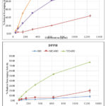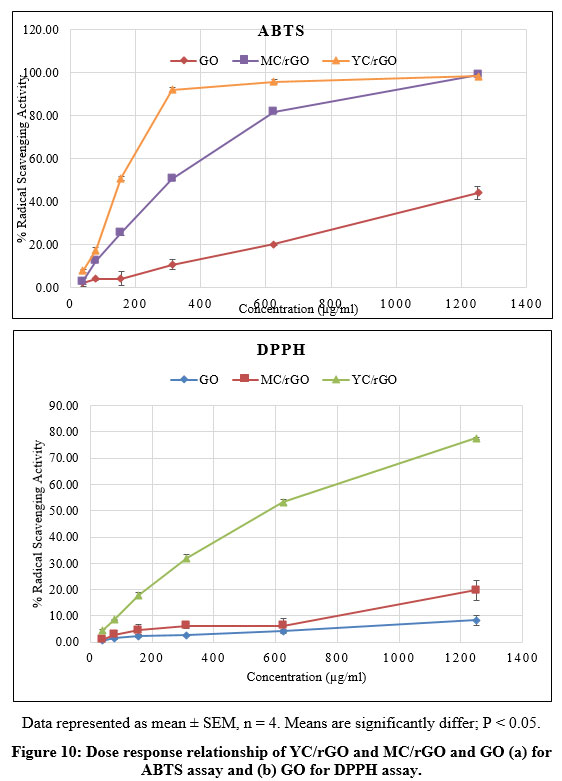 Figure 10 (a) and (b), illustrate that the ABTS and DPPH radical scavenging activities of YC/rGO and MC/rGO and GO are dose dependent. With increasing sample concentration, the percentage of radical scavenging increases.