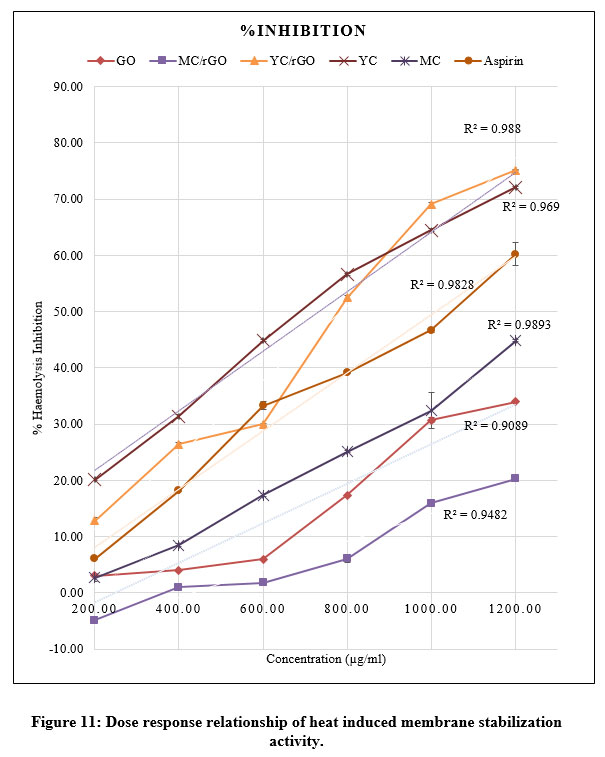 In a dose dependent manner, test extracts were able to protect red blood cells against heat induced lysis (Figure 11) and the inhibition potential was comparable with the NSAID, Aspirin. YC/rGO reported a maximum inhibition of 75.15 ± 0.14% at 1200 µg/ml. The IC50 of YC/rGO was obtained at 784.09 ±2.68 µg/ml at a correlation coefficient value (r2) of 0.97 (Table 3). The standard drug, aspirin was reported with a maximum inhibition of 60.24 ± 2.11% at 1200 µg/ml. Because MC/rGO has a -4.85 ± 0.32% at 200 µg/ml, it induces erythrocyte lysis at low concentrations. Moreover, MC/rGO showed the minimum inhibition potential against heat induced lysis of erythrocytes, since MC/rGO obtained the highest IC50 at 2437.50±17.52 µg/ml (r2 = 0.98).