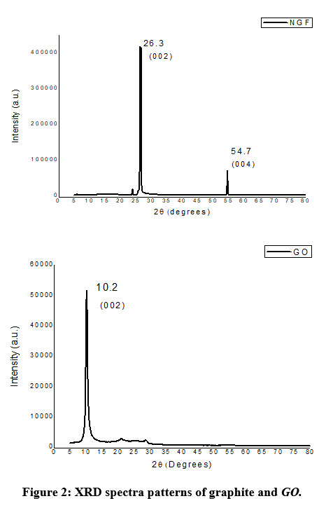 The successful synthesis of GO from natural graphite flakes (NGF) was confirmed by X-ray diffraction analysis and removal of oxygen containing functional groups of GO has been clearly shown by using Raman and FTIR analysis as shown later.