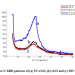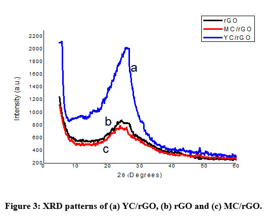 XRD spectra of chemically reduced rGO, young C.arabica-reduced graphene composite (YC/rGO) and matured C.arabica-reduced graphene composite (MC/rGO) are shown in Figure 3.