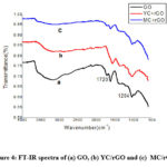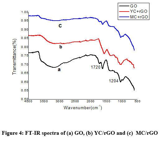 Figure 4: FT-IR spectra of (a) GO, (b) YC/rGO and (c)  MC/rGO