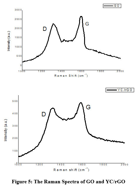 Raman analysis was used to confirm the structural changes in the green reduced GO.  Since YC/rGO composite shows high intensity peaks in XRD and FTIR analysis, Raman analysis and SEM analysis were conducted only for YC/rGO composite for further verification. Figure 5 shows Raman spectra of GO and C.arabica-reduced GO (YC/rGO). The Raman spectra of rGO shows D peaks at ≈1350 cm-1and G peaks at ≈1590 cm-1 ensuring the lattice distortions. The ID/IG peak intensity ratios are about 0.8 and 0.9 for GO and YC/rGO, respectively, confirming the reduction in the average size of sp2 domains and edge defects as a result of some C=C bond reduction in graphene oxide25. Moreover, it was found that a higher ID/IG ratio indicates fewer oxygen groups 11.