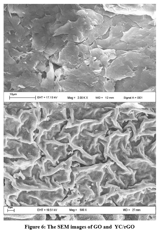 The SEM images of GO and YC/rGO in Figure 6 depicts the rigid appearance of GO flakes as well as the corrugated silky cloth-like appearance of YC/rGO as a result of the formation of thin rGO layers. After splitting into thin layers, this wavy form is common in thin materials 26.