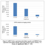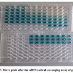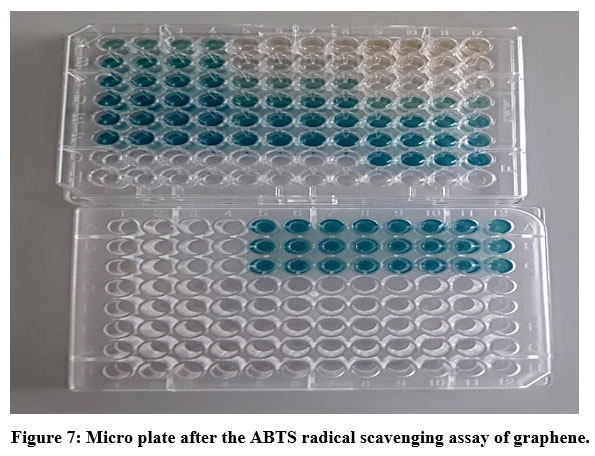 When considering the ABTS radical scavenging assay, ABTS•+ was generated through a reaction between potassium persulfate and ABTS. The reaction leads to produce blue/green ABTS•+ chromophore with strong absorbance at wavelength of 734nm. A stable form of radical was generated prior to the response with antioxidant molecules. Decolouration was observed as in figure 7, after reaction with antioxidant molecules present in the reaction mixture 27.