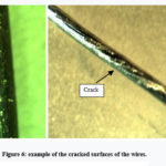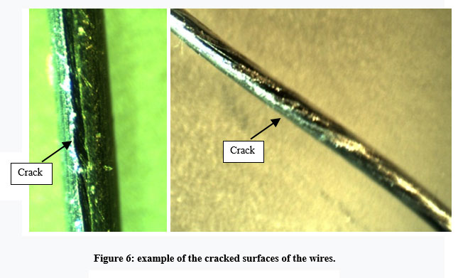 Figure 6 shows two examples of the cracked surfaces of the wires. Those cracks greatly affect the fatigue resistance of the whole wire rope with beads.