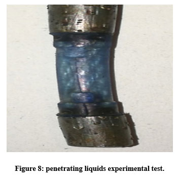 To evaluate the effect of the environment on the wire rope, tests were carried out with penetrating liquids (blue ink). Liquids were poured onto the flexed sample to simulate operational behavior. Figure 8 shows the penetrating liquids experimental test.