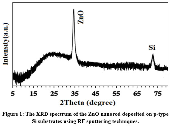 Figure 1: The XRD spectrum of the ZnO nanorod deposited on p-type Si substrates using RF sputtering techniques. |