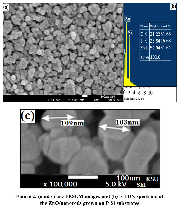 The surface of the ZnO/P-Si was analyzed using FESEM and component elements are analyzed using EDX and their atomic composition is shown in figure 2a. The figure clearly illustrates the smooth, homogeneous, and compact surface of the ZnO nanoparticles without any pores. Shaped ZnO nanorods and the aspect ratio, nanorod lengths, diameters, and nanorod number density correlate with the type of substrate. Based on SEM images, it was found that the diameters of ZnO Nanorods were between 103-109 nm (figure 2c). The percentage gives a description of the atomic composition of the elements in the layers, as shown in the inset table. The peaks show the concentration of these elements, and it is evident that the elements corresponding to the peaks are part of the layer. There were no impurities detected in the samples. This indicts that our sample are with good purity and concentration of ZnO molecules with atoms bonded to Si substrate18-19.