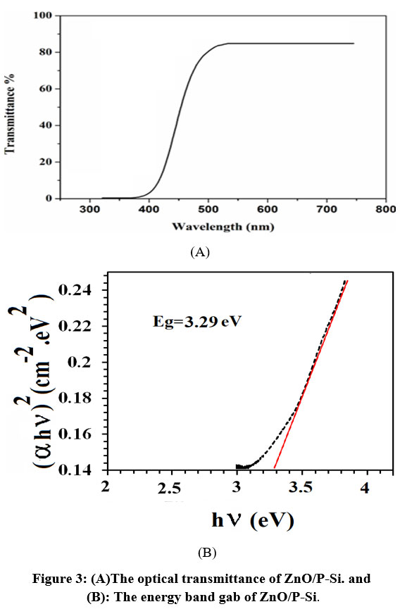 Figure 3: (A)The optical transmittance of ZnO/P-Si. and (B): The energy band gab of ZnO/P-Si. |