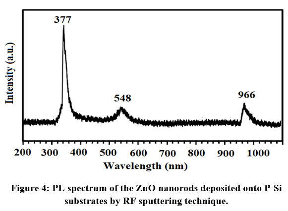 Figure 4 depicts the PL spectrum of ZnO/nanorods on P-Si. A total of 200-1200 nm in wavelength was covered by the spectral data collected. Three peaks may be seen in the results. The highest peak was observed at 377 nm, which corresponded to a monocrystalline ZnO thin film. The greatest values second peak in the green spectrum region are found at wavelengths 548 nm 23. The silicon substrate is responsible for the third peak, which is placed at a wave length of 966 nm. We have maintained that emissions with high green values result from the defect level transition of antisite-oxide atoms (OZn). The oxygen vacancies (VO) and zinc interstitials (Zni) are the primary contributors (donors) to the oxidative stress (Zni). Because of the low production energy of the antisite-oxide, antisite oxide (OZn) in tissues at high oxygen saturation states can be easily formed from interstitial oxides (Oi) and zinc vacancies (VZn) in the presence of oxygen. Several studies have demonstrated that the ionization of individual oxygen-vacancy atoms is effective for the production of green emission, which results from the recombination of photogenerated holes with an individually ionized charge. Equation (8) have been applied to determine the optical energy band-gap (Eg) from the maximum emission wavelength of the ZnO thin film at λmax = 377nm . The obtained result is3.289 eV, which in good agreement with UV result.