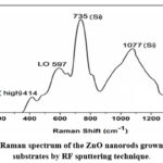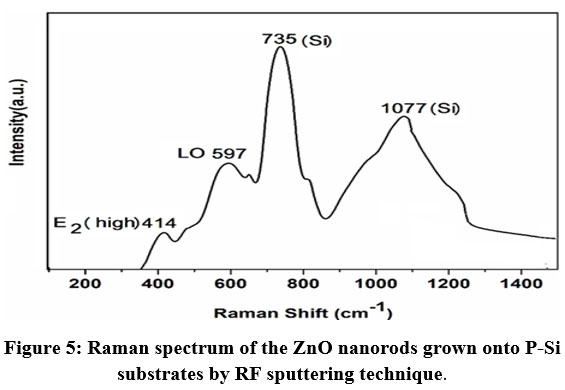 Figure. 5 displays the spectrum of the sputtered ZnO/nanorod layer onto P-Si substrate. Tow Raman shifts at 414 cm-1 and 597 cm-1 were seen for ZnO thin film. The peaks located at 414 cm-1 can be attributed to ZnO E2 (high)while the second on at 597 cm-1 is associated with A1 longitudinal optical (LO) mode. The shift of the E2 (high) from the standard value of the phono mode for the ZnO bulk material 437 cm-1 to was came from the tensile strain in the films, which is highly confirmed the XRD determination. O-vacancy and Zn interstitial are both generate the A1 (LO) phono mode, and the height of the intensity of this mode is direct proportional to these defects in the crystal ZnO thin film. The results also showed that tow Raman shifts at 735 cm-1 and 1077 cm-1 correlated to the P-Si substrate24.