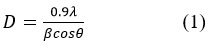 the crystallite size is denoted by D measured in (nm) and 0.9 is called a Scherer constant, while λ is expressed the wavelength of the X-ray using Cu-Kα source radiation (λ = 0.15406 nm) and theta measured in degree which is expressed the Bragg angle. β is mean the Full-Width Half-Maximum (FWHM). The obtained crystallite size was 78 nm.