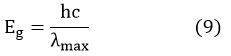 where ν is the frequency of the photon, (α) is expressed the absorption-coefficient, (Eg) is the energy gap of thin film in eV, h is the Planck’s constant, A is a constant, and n associates with the type of energy band gap due to the electron transition (for directly band gap n = 1/2).