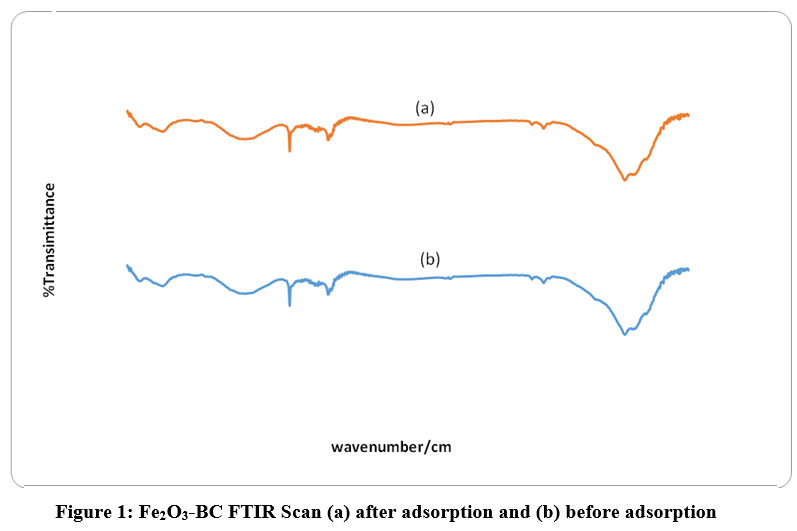 Figure 1: Fe2O3-BC FTIR Scan (a) after adsorption and (b) before adsorption.