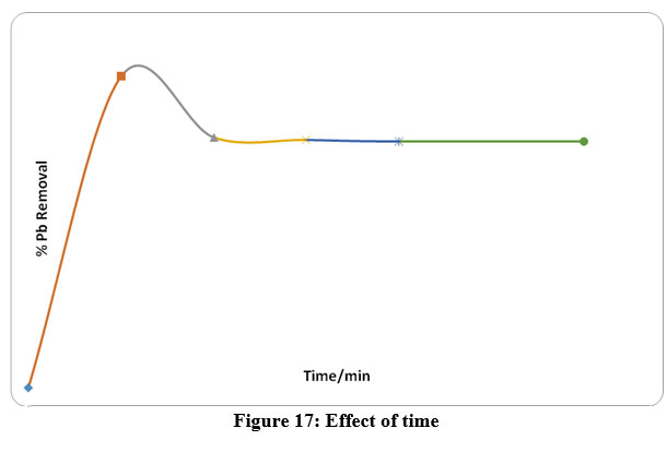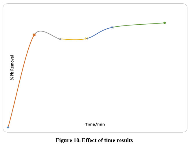 Figure 10 shows that the percentage Pb removal increases rapidly to 73% in the first 20 minutes and gradually increase to 79% in a binary Pb aqueous solution. In Figure 7, the percentage Pb removal was rapid in the first 20 minutes to 81%, approached constant from 30 minutes (63%) to 62% after 90 minutes of shaking in a ternary aqueous solution. Fe3+ ions being smaller could have occupied the smaller octahedral voids in the BC, and all the tetrahedral voids left unoccupied. Pb2+ ions due to the size could have been occupying the all the available tetrahedral sites in the BC making the percentage removal differences small. For the binary and ternary solutions, percentage removals decreased from a highest of 97% in the first 20 minutes to a lower value of 73% then increased to 79%. A constant percentage removal of 62% was achieved in ternary aqueous solutions after 90 minutes.