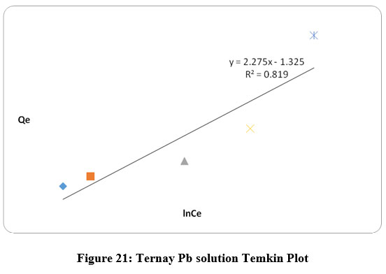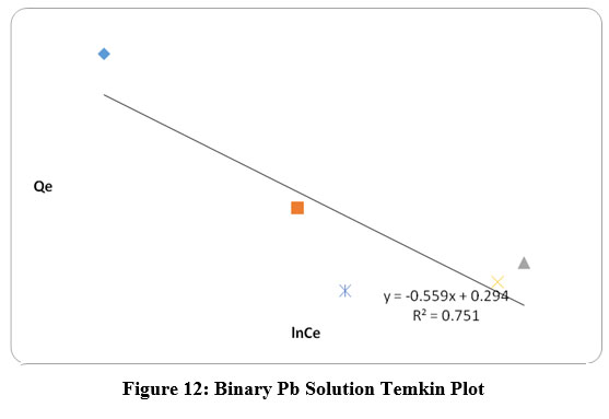 Figure 11 shows the langmuir isotherm for the sorption of Pb2+ ions onto the adsorbent in a binary solution with R2 value of 0.655 deviating slightly from unity. The multisites provided by Fe3+ and Pb2+ ions present in the binary solution might be reponsible for the deviations in the langmuir plot. Langmuir isotherm fail when the adsorption surfaces become inhomogenous and this adsorption kinetics of binary systems can be better described using pseudo second order kinetics. In figure 12, the Temkin plot with the R2 value of 0.751 shows that the results obtained do not fit well with this isotherm. Figures 11 and 12 describe isotherms of binary solutions. Figures 19 and 20 describe the Langmuir isotherm for the sorption studies of MO dye and Pb2+ ions onto the adsorbent with R2 values of 0.814 and 0.987 respectively. Pb2+ ions are fitting well as compared to MO dye in ternary solutions. Figures 21 and 22 are Temkin plots of Pb2+ ions and MO dye with values 0.819 and 0.00 respectively, suggesting that the MO dye does not fit into this isotherm in a ternary solution. For the Pb2+ions the Langmuir Isotherm plot had the best fit in ternary solution with R2 value of 0.987 suggesting monolayer adsorption is predominant.