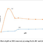 The effects of initial pH on adsorption for Pb were investigated at pH 2, 4, 10 and 12 using a 50 ml solution of 5 mg/L for Pb, with 50 mg of Fe2O3-BC. For MO dye the effect of initial pH on adsorption were investigated at pH 2, 4, 8, 10 and 12 using a 20 mL of 50 mg/L of MO solutions of 50 mg Fe2O3-BC.