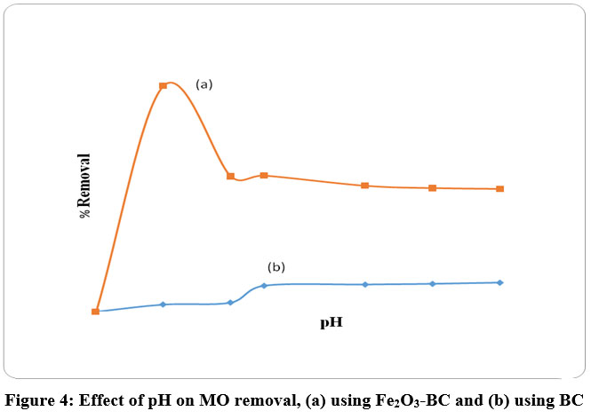 Figure 4: Effect of pH on MO removal, (a) using Fe2O3-BC and (b) using BC.