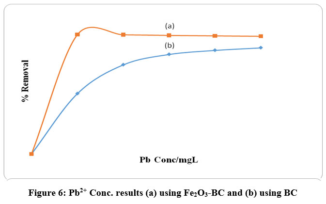 Figure 6: Pb2+ Conc. results (a) using Fe2O3-BC and (b) using BC.