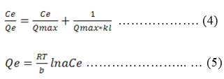 Where Qmax, and kl are the maximum adsorption capacity for the solid phase loading and the energy constant related to the heat of adsorption respectively.  Plotting Ce/Qe versus Ce, gives a straight line with Qmax and kl determined from the intercept and the slope of the graph respectively. Also a plot of Qe versus lnCe gives a straight line (Li et al., 2012, Nechifor et al., 2015)