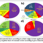 Figure 1: Global material shares according to a) their origin, b) their application areas, and c) their fate [1]. d) global share of economic sectors according to gross domestic products [2]. |