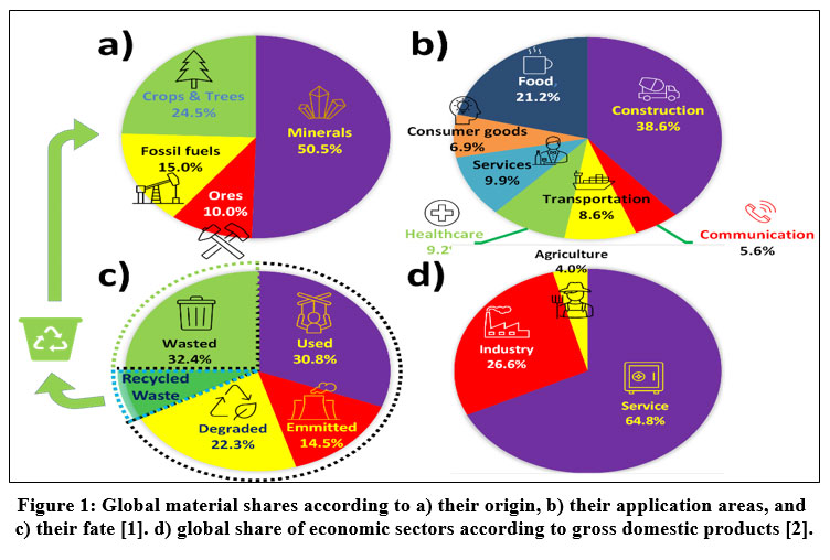 Human population has been increased more than 10 times since industrial revolution and it is expected to increase more than 20% in the next 80 years. Considering the currently used materials and production techniques, 1-fold increase in population causes 1.8-fold increase in demands. This increase leads to development of new materials and production techniques. Today, annual material consumption has exceeded 100 billion tons. As seen from Figure 1, minerals used in the construction industry constitute the largest share of this consumption. Even more interestingly, the proportion of waste materials is greater than that used. As can be seen from Figure 1c, the share of recycled materials in total consumption is very low (around 8.54%) 1. From the economical point of view (Figure 1d), the service sector has the largest share among the economic sectors, but it is directly dependent to primary (agriculture, raw material production etc.) and secondary sectors (industrial production) 2.