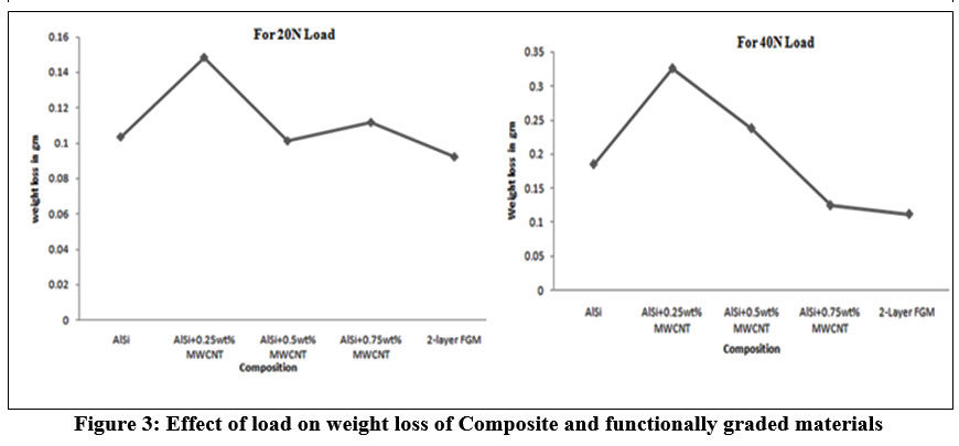 Figure.3 shows Effect of load on weight loss of the composite and functionally graded materials, for both 20N & 40N load, the material loss in terms of gram for functionally graded material is less compared to nanocomposites.