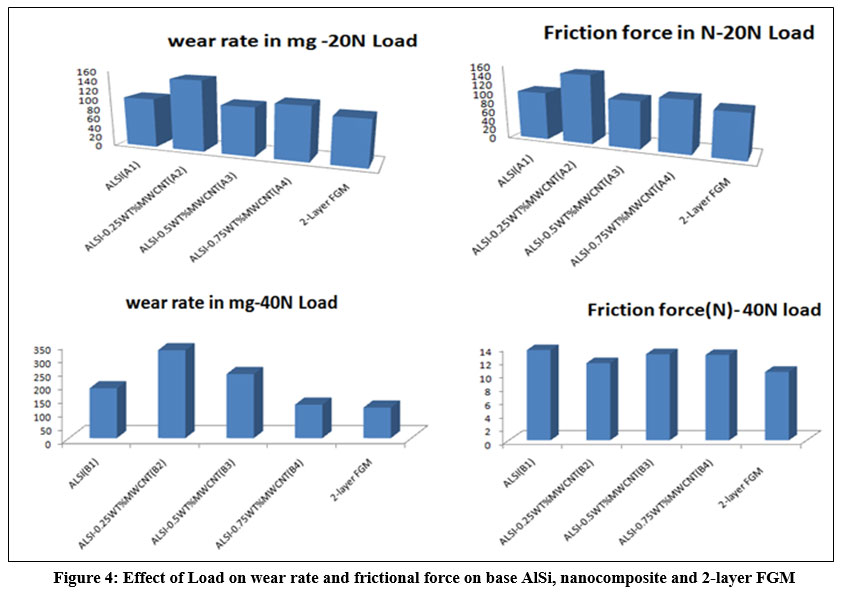 Wear rate and frictional force reduced immensely for functionally graded materials compared to nanocomposites with MWCNT variation in AlSi matrix. Reduction in wear rate and friction force is due to the proper bonding and uniform dispersion of multi wall carbon nanotubes in the AlSi matrix. Wear rate is very less for 40N load when compared to 20N load for functionally graded material.