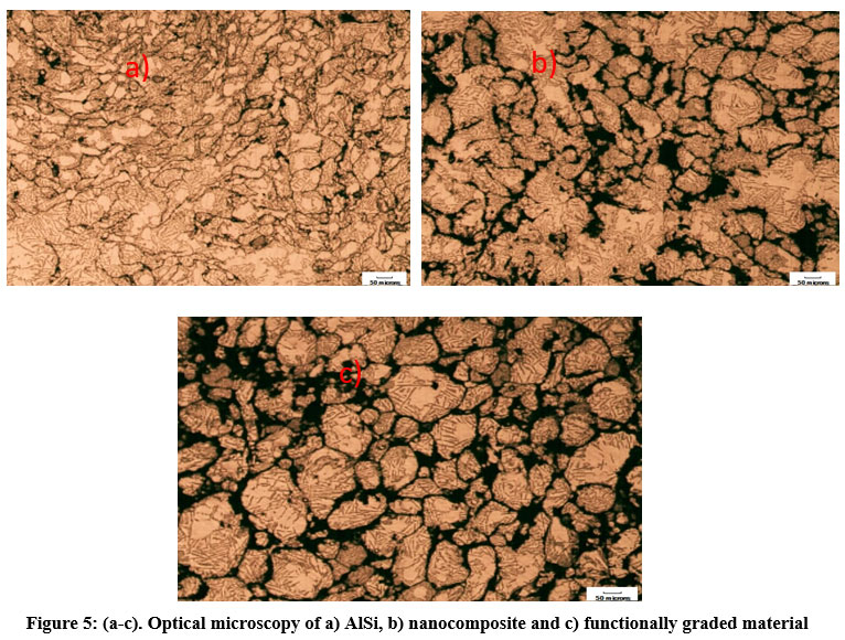 Figure 5: (a-c). Optical microscopy of a) AlSi, b) nanocomposite and c) functionally graded material. |
