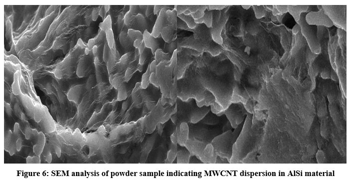 Multi wall carbon nanotubes (MWCNT) dispersed uniformly in Aluminum silicon (AlSi) matrix as clearly seen in Figure-6. Uniform dispersion is achieved with the help of ball milling process with suitable milling parameters.