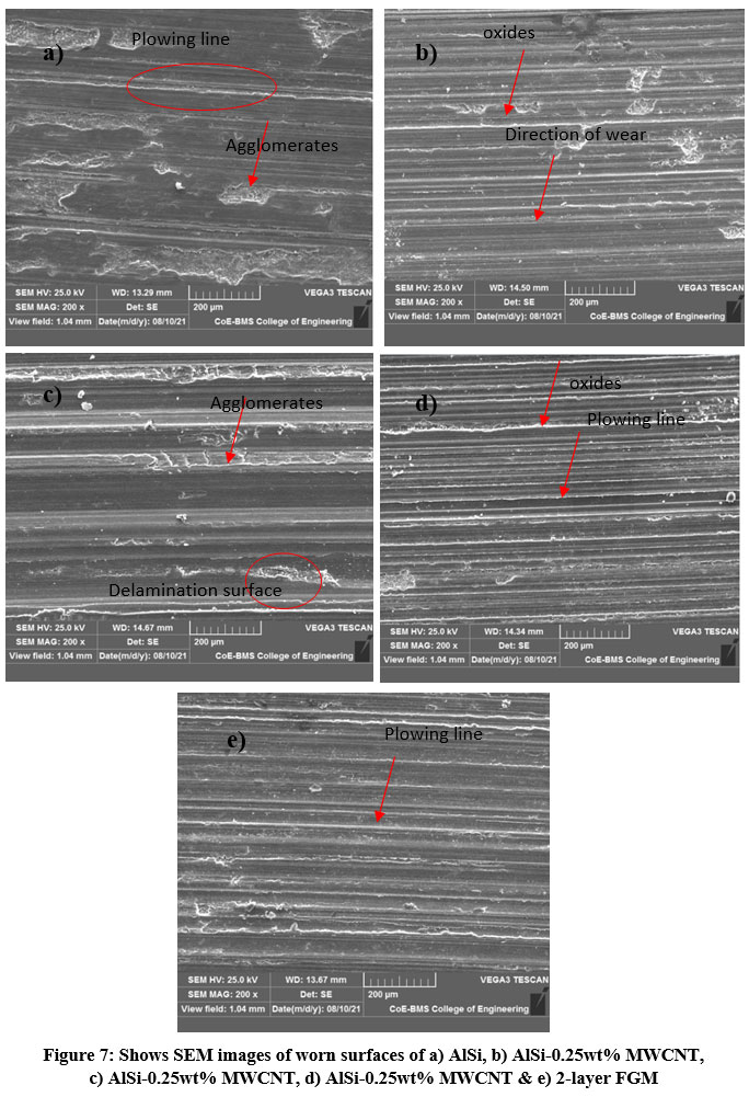 Figure 7: Shows SEM images of worn surfaces of a) AlSi, b) AlSi-0.25wt% MWCNT, c) AlSi-0.25wt% MWCNT, d) AlSi-0.25wt% MWCNT & e) 2-layer FGM |
