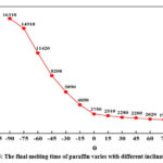 Fig. 5 shows the variation of the final melting time and inclination angle of paraffin. It can be seen that, as θ rotates from -90° to 90°, the paraffin melting time is gradually accelerated. When θ = 90 °C, the heat transfer within paraffin is dominated by heat conduction. At this time, the paraffin melted slowly, with a maximum melting time of 16310s. When θ changes from -90° to 0°, the natural convection heat transfer effect plays an extremely obvious role in promoting the heating and melting heat storage process of paraffin, which makes the melting efficiency of paraffin increase significantly. At θ = 0 °C, the paraffin melts completely at 2750s, which is about 5.9 times faster than -90° for the whole melting rate. As θ increases the inclination angle from 0° to 90°, the rate of paraffin melting increases slowly. However, at θ = 90°, the paraffin melted the fastest, with a melting time of 1890 s. At this point, the paraffin melting speed was increased by about 8.6 times.