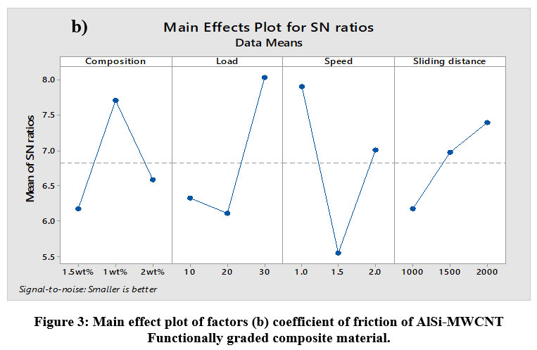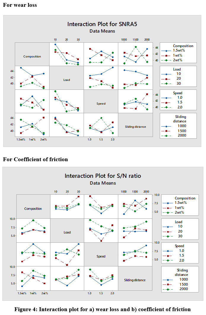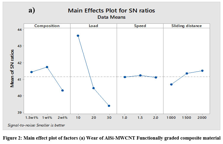 ANOVA results revealed that the most important factors influencing the sliding wear of the functionally graded composite material were the composites themselves (in terms of their individual percentage contributions) that load (p=29.89%) having maximum influence on the wear loss Composition (p=7.73%), sliding speed (p=0.5%), sliding distance (p=1.54%) having contribution towards wear loss. The interactions had less effect on the wear loss.