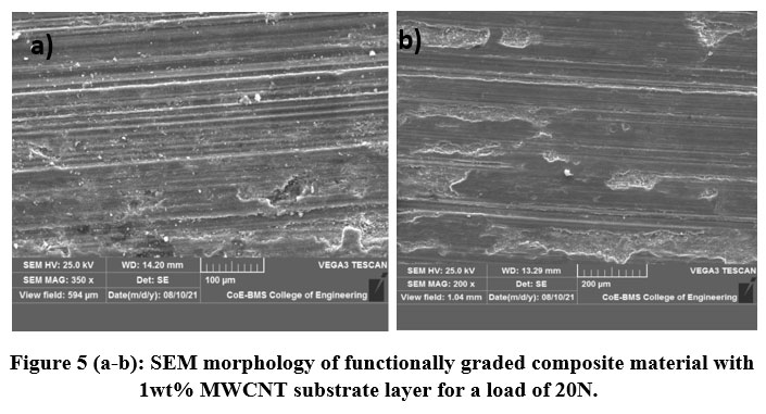 Figure 5(a-b): SEM morphology of functionally graded composite material with 1wt% MWCNT substrate layer for a load of 20N. |