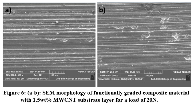 Figure 6 (a-b): indicates SEM morphology of functionally graded composite material with 1.5wt% MWCNT substrate layer for a load of 20N. SEM images indicating finer grooves with plastic deformation at the edges of the grooves. The surfaces appear to smooth due to reinforcement of multi wall carbon nanotube. Due to proper dispersion of multi wall carbon nanotube in the Aluminum silicon matrix, there is a reduction in wear loss of the material and fine groove formation.