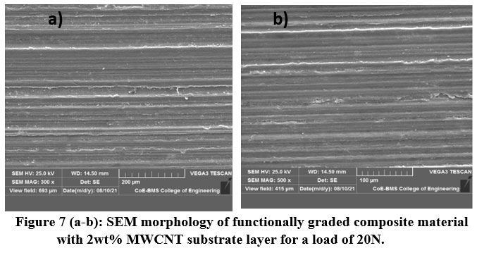 Figure 7 (a-b): indicates SEM morphology of functionally graded composite material with 2wt% MWCNT substrate layer for a load of 20N. SEM images indicating finer grooves the surfaces appear to intact due to reinforcement of multi wall carbon nanotube. Due to proper dispersion of multi wall carbon nanotube in the Aluminum silicon matrix, there is a reduction in wear loss of the material and fine groove formation. Thus, it indicates the increase in the reinforcement weight percentage i.e., multi wall carbon nanotube helps in providing the better wear resistant material.
