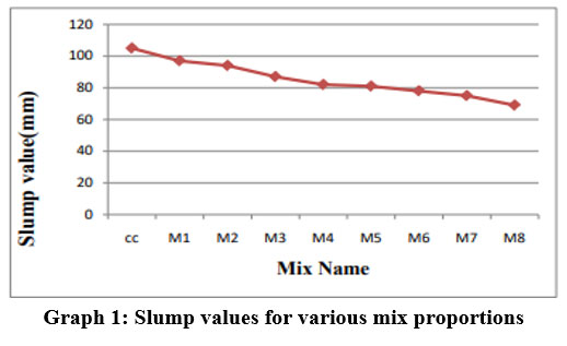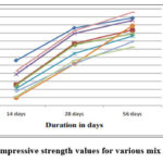 At 14 and 28 days after curing, concrete blend compressive strength is seen to be declining. The mixes’ compressive strength increases after 56 days.