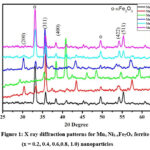 Figure 1: X ray diffraction patterns for Mnx Ni1-xFe2O4 ferrite (x = 0.2, 0.4, 0.6,0.8, 1.0) nanoparticles |