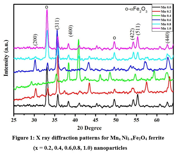 Table 1: Structural parameters for Mnx Ni1-xFe2O4 ferrite (x = 0.2, 0.4, 0.6, 0.8, 1.0) nanoparticles