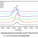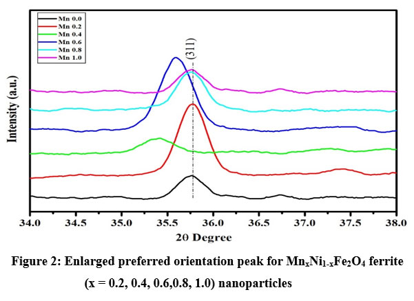Figure 2: Enlarged preferred orientation peak for MnxNi1-xFe2O4 ferrite (x = 0.2, 0.4, 0.6,0.8, 1.0) nanoparticles |