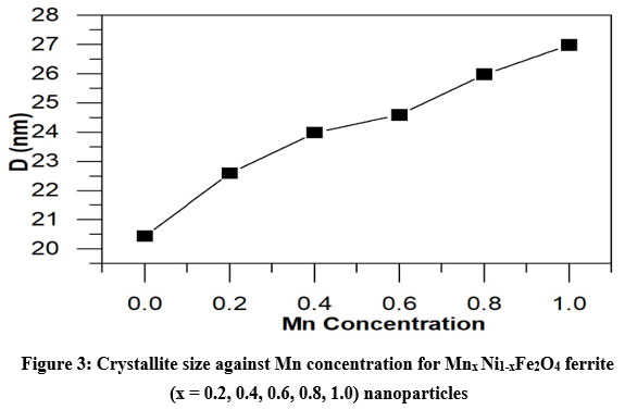 Figure 3: Crystallite size against Mn concentration for Mnx Ni1-xFe2O4 ferrite (x = 0.2, 0.4, 0.6, 0.8, 1.0) nanoparticles |