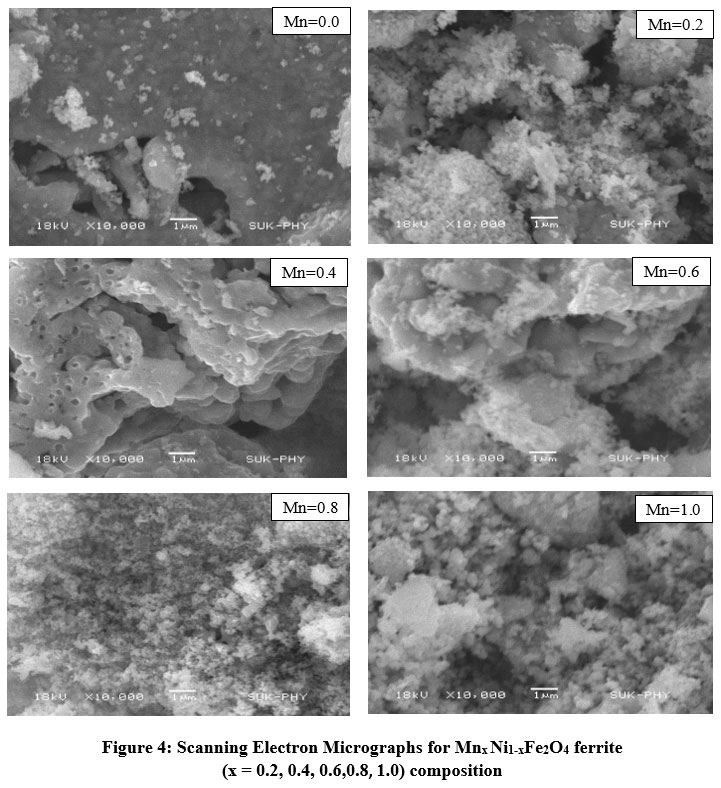 Figure 4: Scanning Electron Micrographs for Mnx Ni1-xFe2O4 ferrite (x = 0.2, 0.4, 0.6,0.8, 1.0) composition |